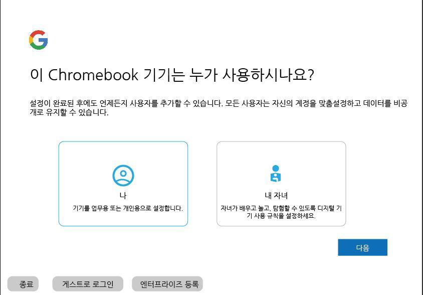 초기화한 크롬북을 켜면 다음과 같은 화면이 나타납니다. 아래쪽에 엔터프라이즈 등록을 클릭합니다.