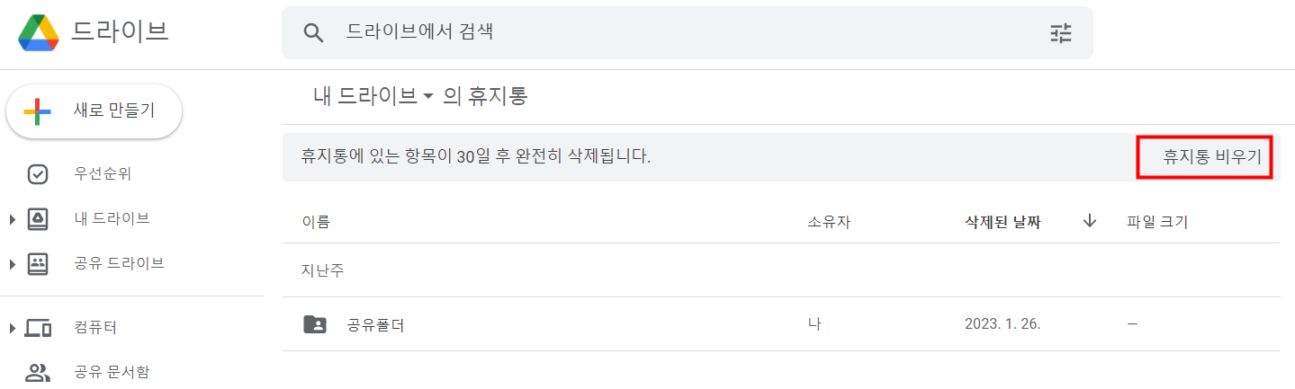 5. 지운 파일을 휴지통에서 휴지통 비우기로 지워줍니다.
