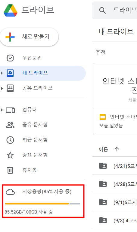 2. 구글드라이브 왼쪽 하단의 저장용량 메뉴를 클릭합니다.