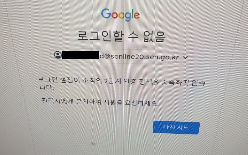 이 문제를 해결하기 위해 관리자는 admin.google.com 에 접속하여 보안-개요-2단계 인증으로 이동하여 해당조직에 2단계 인증을 '사용안함' 으로 설정한 조직에다가 해당 사용자를 이동하면 됩니다.