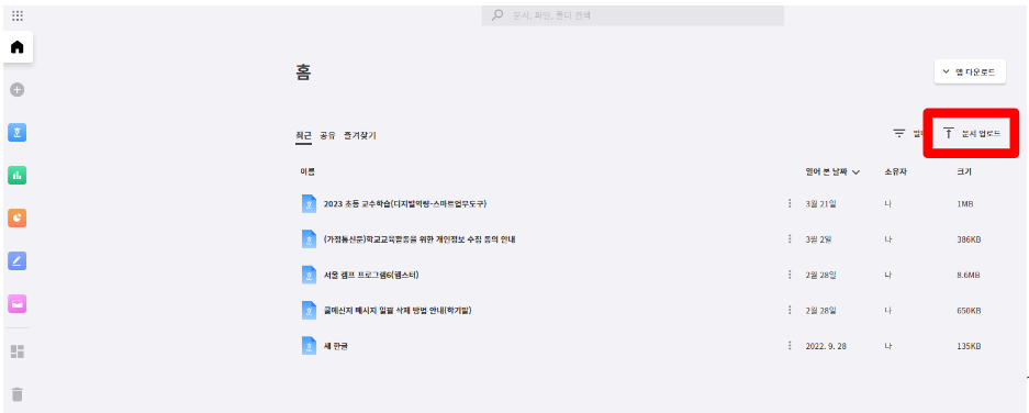 3. 홈화면이 나타나면 문서 업로드를 클릭합니다.