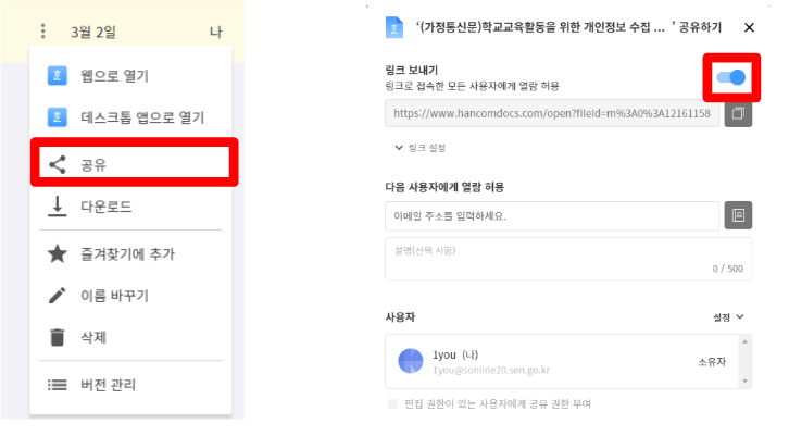 6. 버튼이 나오면 공유 메뉴를 클릭하고 링크 보내기를 활성화 시켜 둡니다.
