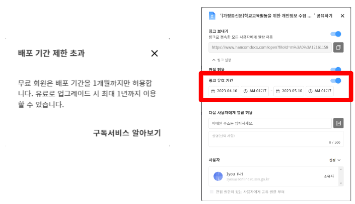 8. 다만 링크 공유로 활성화한 무료 사용자의 경우에는 공동작업 기간이 한달이 최대입니다.