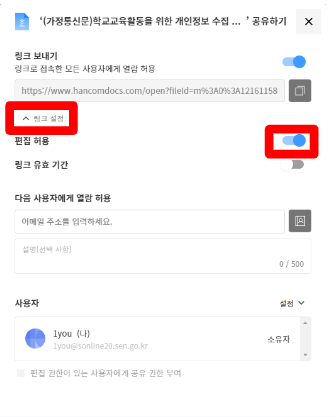 7. 링크설정 메뉴를 클릭하고 편집허용에 체크해 둡니다.