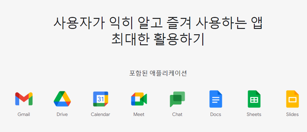 이전에 G Suite로 알려졌던 Google Workspace는 Gmail, Google Drive, Google Docs, Google Sheets, Google Slides, Google Meet, Google Chat, Google Calendar 등 인기 있는 앱 제품군을 제공합니다.