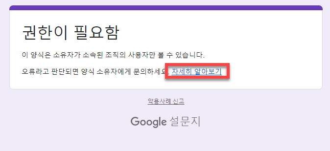 구글설문지를 사용하다보면 '권한없음' 메세지가 뜨는 경우가 있습니다. 이 경우는 구글의 동기화로 인하여 설문지가 권한이 없는 가족이나 개인의 다른 계정으로 열렸기 때문에 메세지가 뜨게 됩니다.
