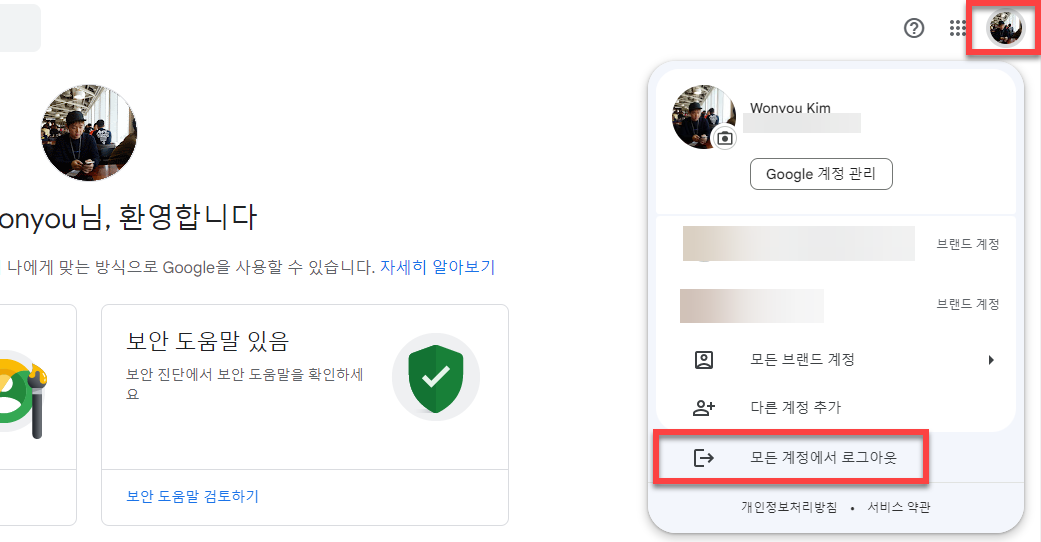 3. 오른쪽 상단 사진을 클릭하여 모든 계정에서 로그아웃 한 후, 해당 회사나 학교에서 승인받은 아이디(예: 구글클래스룸 아이디)를 입력합니다.