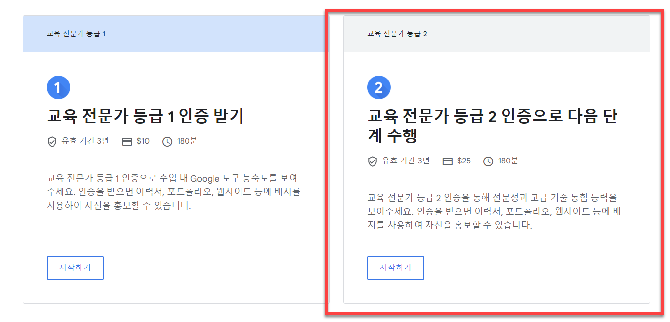 레벨 2 인증은 더 고급이며 이미 레벨 1 인증을 획득한 교육자를 위해 설계되었습니다. 레벨 2 시험은 프로젝트 기반 학습, 맞춤형 학습, 코칭 기술과 같은 Google for Education 인증 혁신 기술을 포함하여 Google 도구 사용에 대한 고급 기술 및 지식에 중점을 둡니다. 응시료는 25불 입니다.