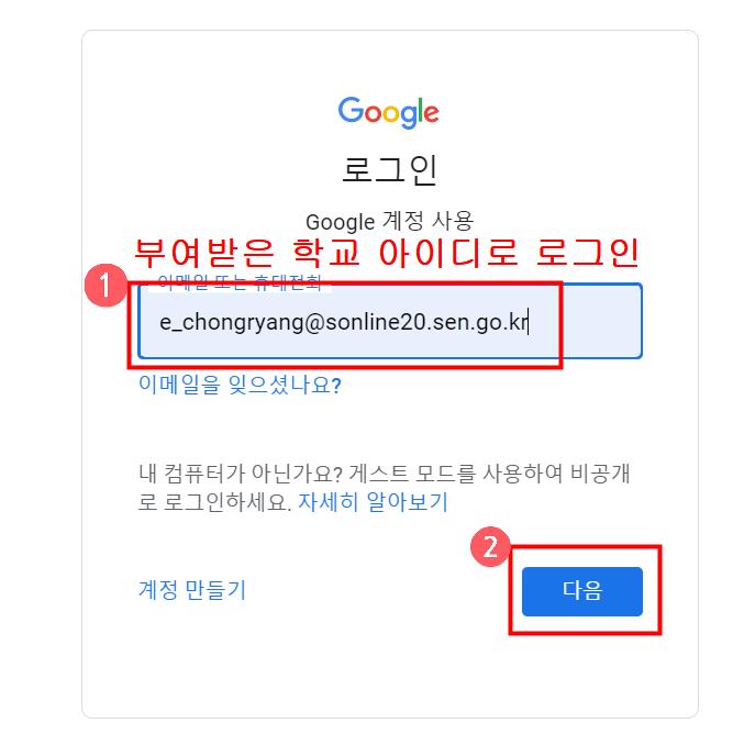 1. admin.google.com으로 접속합니다. 부여받은 G suite 학교관리자 계정을 치고 다음 버튼을 클릭합니다.