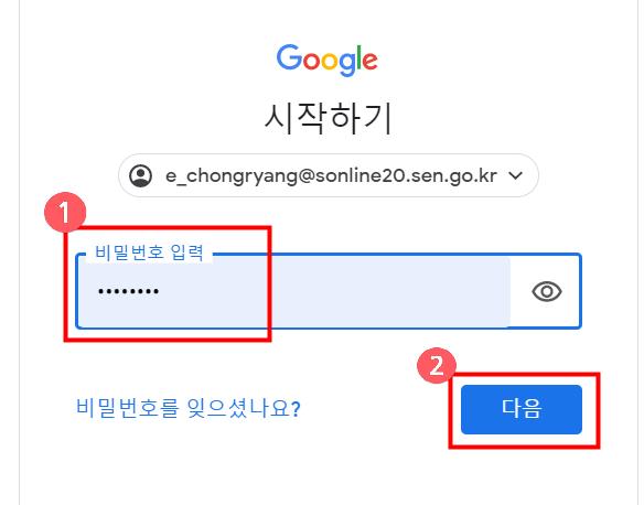 2. 부여받은 비밀번호를 입력하고 다음버튼을 클릭합니다.