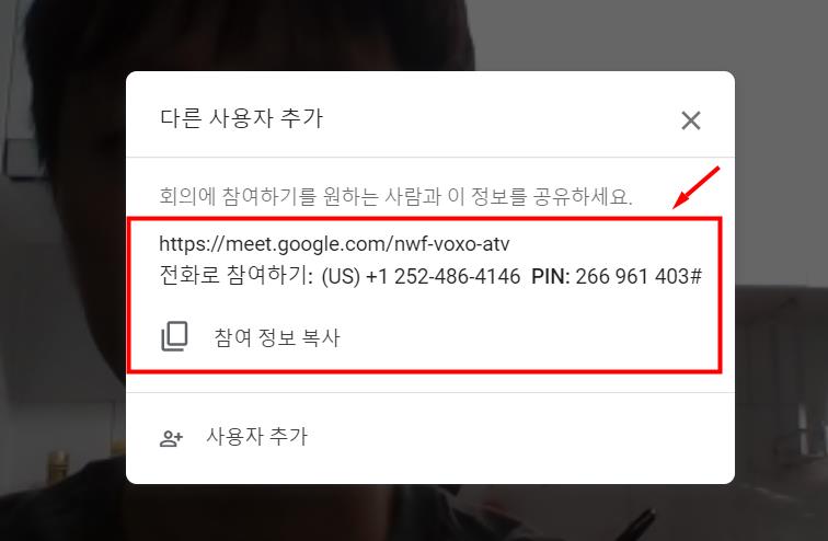 참여정보 복사를 눌러서 초대하고자 하는 사람에게 카카오톡이나 메신저로 보내주면 사람들이 쉽게 참여할 수 있다. 사용자 추가로 메일을 보내 일일이 초대할 수 있지만 보통은 잘 쓰지 않게 된다. 스마트폰으로 접속하는 사람들은 플레이스토어나 앱스토어에서 MEET 앱을 깔아야 하고 컴퓨터로 접속하는 사람들에게는 필요가 없다.