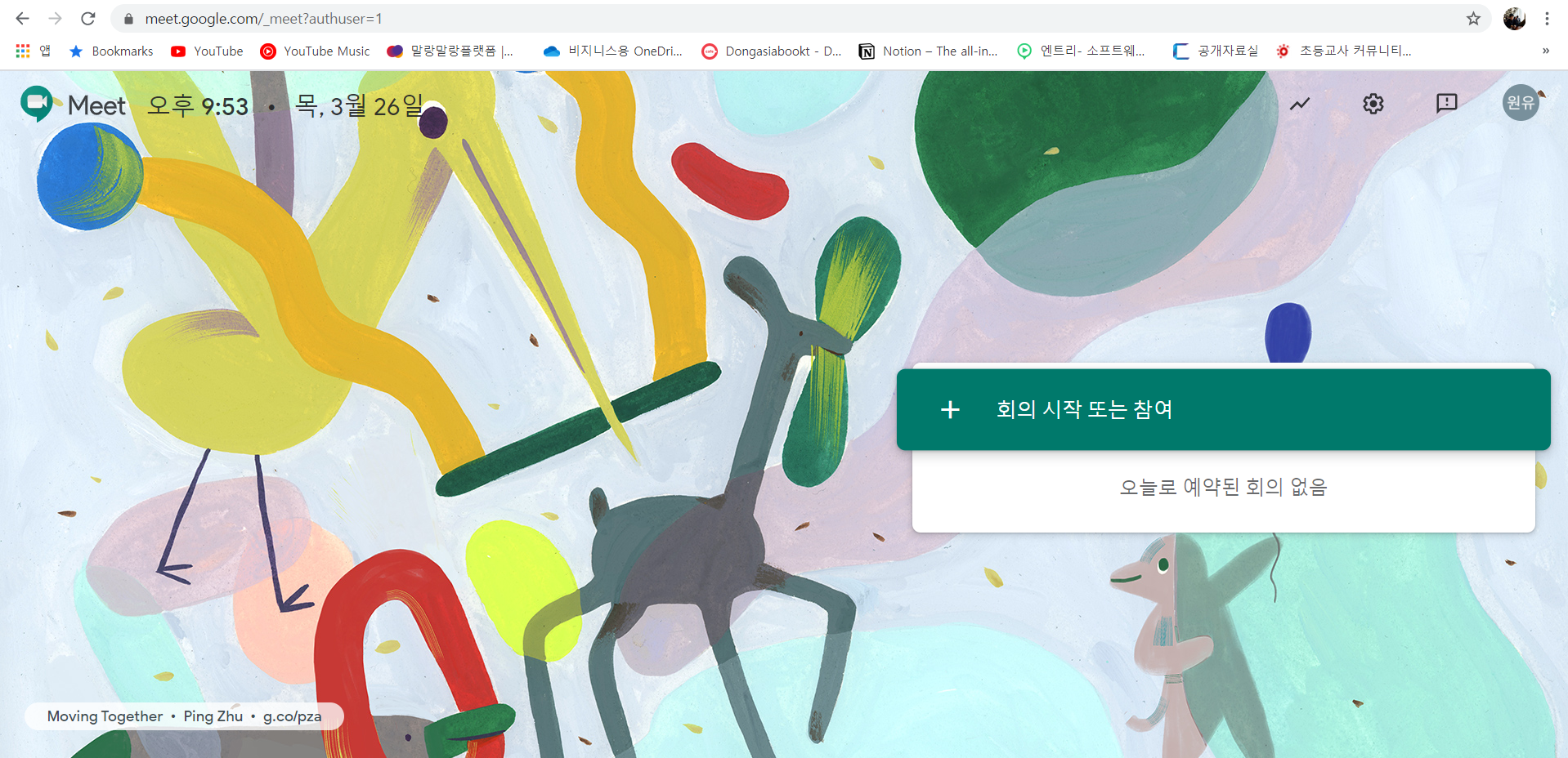 meet.google.com에 접속하면 다음과 같은 화면을 볼 수 있다. G suite 계정을 쓰고 있다면 화면에서 오른쪽 메뉴와 같이 회의 시작 또는 참여 라는 메뉴가 뜨게 된다.