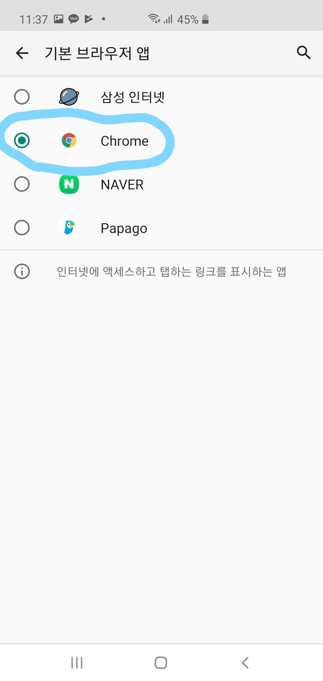 5. 기본 브라우저 앱을 크롬으로 선택합니다.